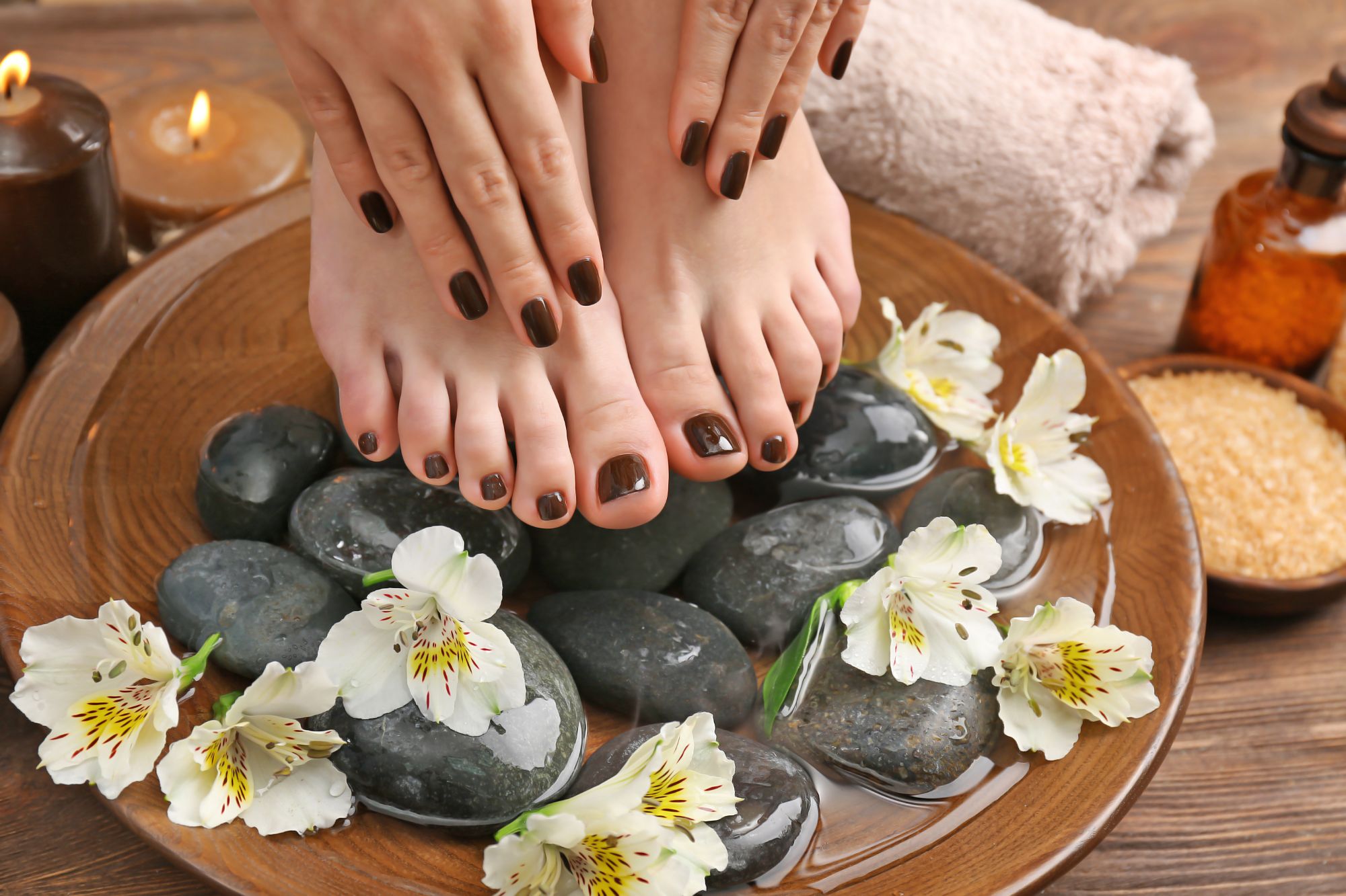 Deluxe Pedicure Euro Spa Pedicure PLUS the callus eliminator, tropical exfoliating sugar scrub with the addition of the foot mask, followed by a leg massage with hot stones and hot towels wrap. |